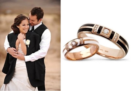 Popular wedding options are those where the enamel passes through a thin line in the center, and the other two sides are strewn with loose stones.