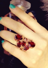 Gold rings with a sensual garnet are very popular. This stone is distinguished by its bright and saturated color, which is able to effectively transform a woman's image and make it more attractive.