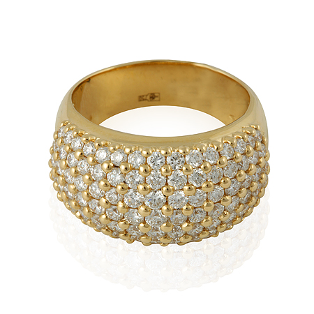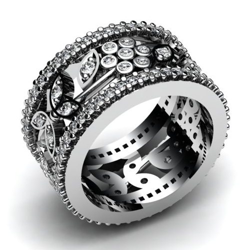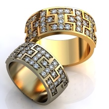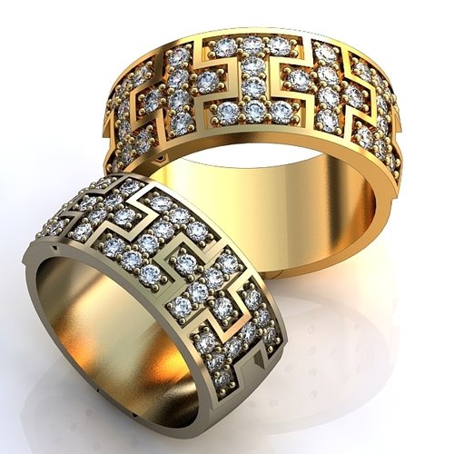 Expensive and luxurious rings look wide. Today, models in the form of a royal crown or an artful interlacing of patterned lines, in which small gems are placed, are especially in demand.