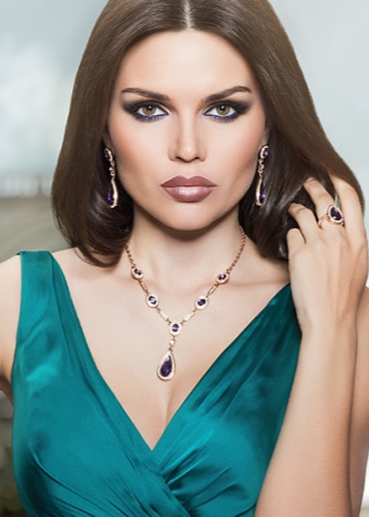 If you want to buy a really bright and unusual decoration, then you should pay attention to accessories with a purple stone. The most common mineral of this color is amethyst. It looks perfect with all the precious metals. Such a thing can bring royal notes to the image.