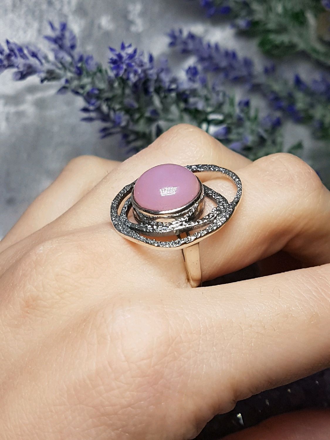 Pink matte round stone looks very much like a pearl. Such a pebble will be a wonderful decoration of a smooth silver ringlet. Very refined and gentle option.