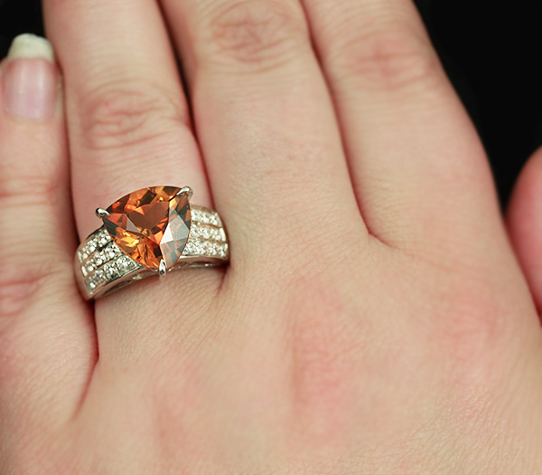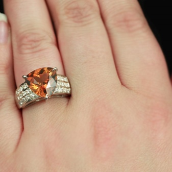 A solid ring with a rauchtopaz will harmoniously fit into the business image. The square shapes of the treated gem underline the strict lines of a strict suit or dress.