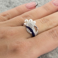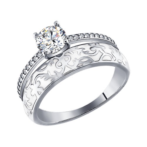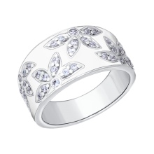 The ring with white enamel and cubic zirconias attracts attention with elegance and sophistication. White enamel looks like luxuriously embroidered fabric. Stones give the product femininity and solemnity. This jewelry can be combined with different earrings and necklace. It fits perfectly with the classic style.