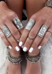 Silver rings on foot are particularly popular in the beach season. Stylish and elegant, they emphasize the tan and the beauty of the foot. The only rule for such rings is an ideal manicure and, naturally, the absence of flaws in the form of corns or calluses on the legs.