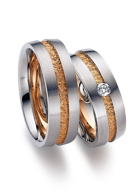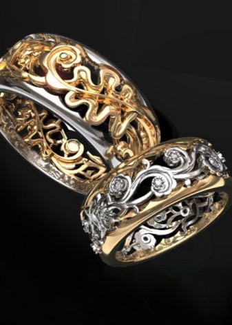 Often, the newlyweds fail to agree on a choice between a silver and a gold ring. Then a great option would be a decoration with inset of gold. This option will be in perfect harmony with all the decorations of gold, silver and platinum. The combination of two colors of metals adds originality, and attracts the attention of others. In addition, the cost of such a model is markedly lower than only gold.