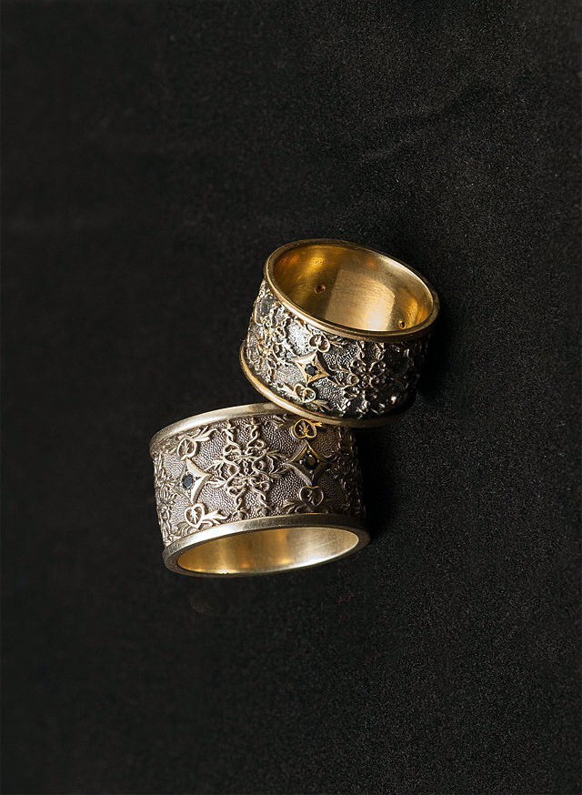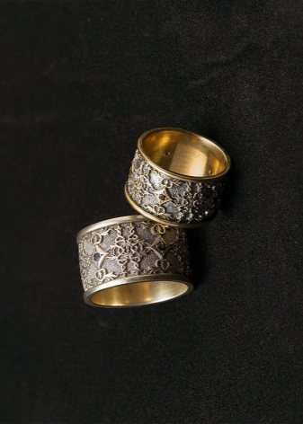 Another model of the combination of gold and silver is the technology of soldering. A thin plate of gold (sometimes brass) is soldered on top of a silver product, thereby guaranteeing a reliable coating, unlike the spraying technique, which over the years loses its original beauty and brilliance.