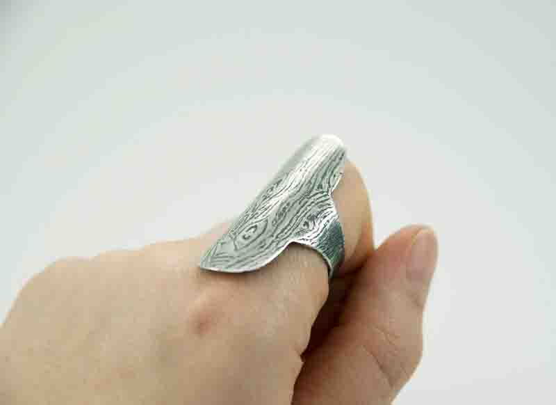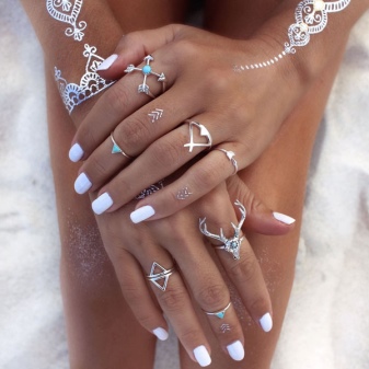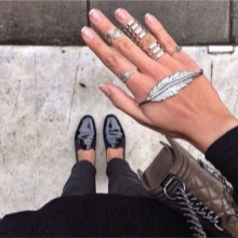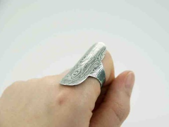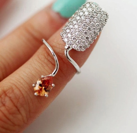 Another type of this model is the rings on the upper phalanx, more precisely, on the nail. With this ring will look harmoniously silver manicure, in tone with the metal. There are many forms of performance of these models. They can be plain or enamelled in bright colors, can be decorated with stones or figures of animals and birds.