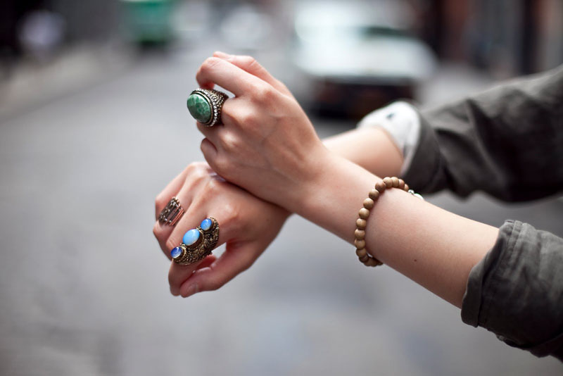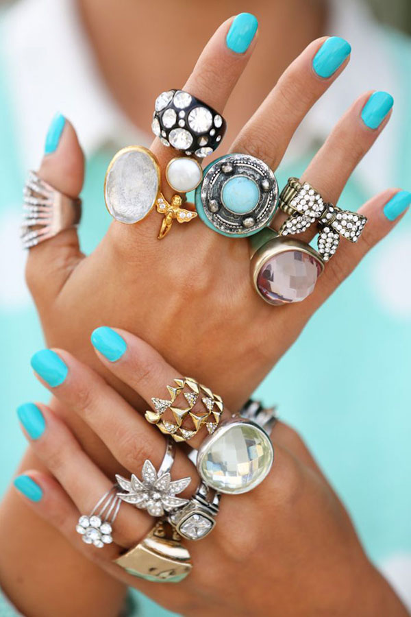For daily looks, stylists advise you to choose smooth rings that match with other jewelery.