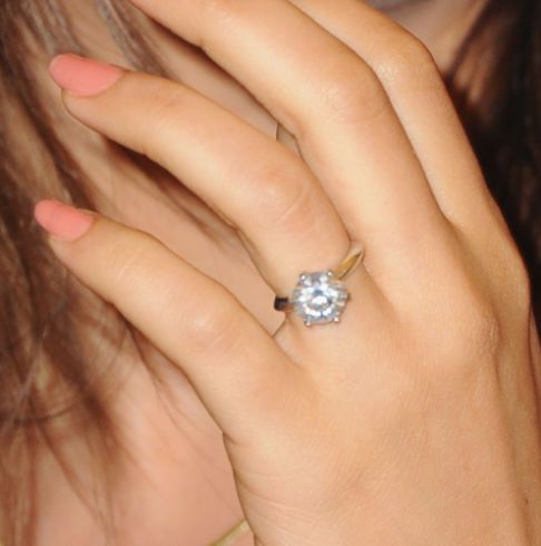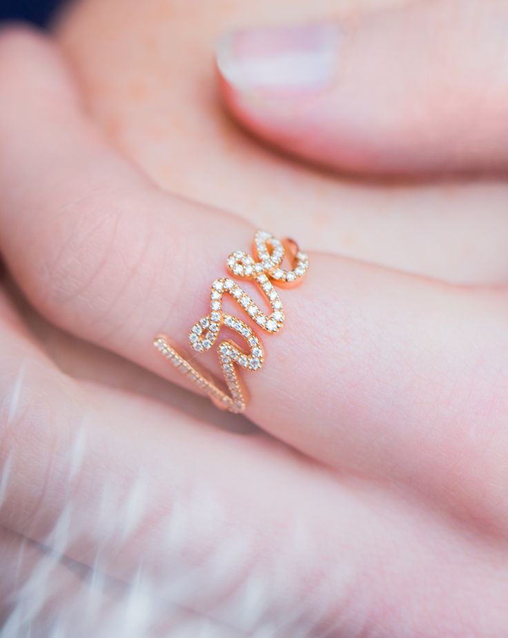 Round-cut diamonds effectively cover the base of the ring in the form of an inscription. The product is made of white gold, thanks to which it looks not just spectacular, but also expensive. The simple design combined with expensive material makes it an incredibly stylish purchase for a girl.