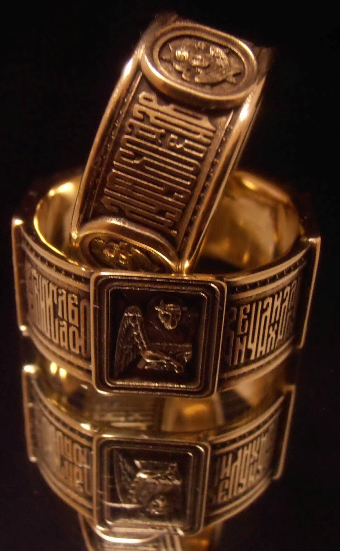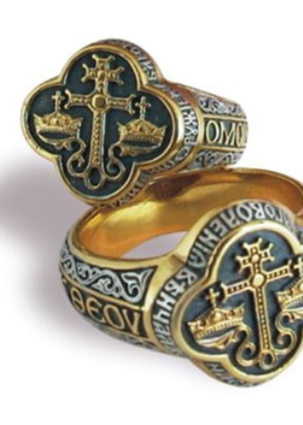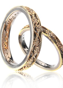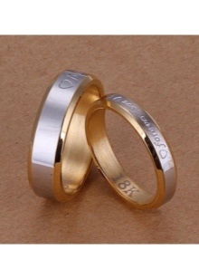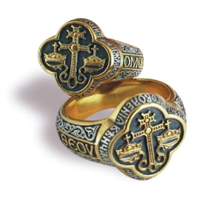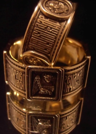 Unlike the standard rings for weddings, the ring goes back to ancient Byzantium. Usually it is a large, massive accessory that looks like a cross. Along the contour of the product, on the sides and on the inside are inscriptions or prayers that will help the newlyweds in family life. Jewelers combine two metals at once in such rings. The female version includes a silver product with a gold insert.