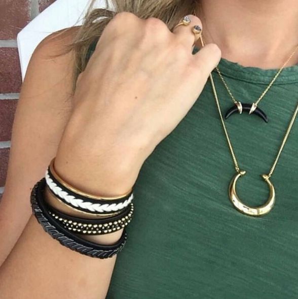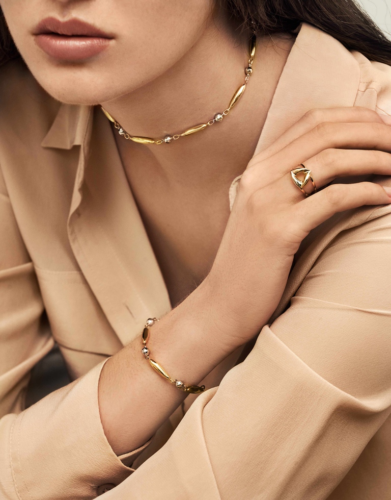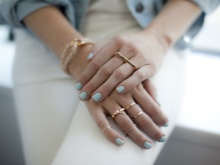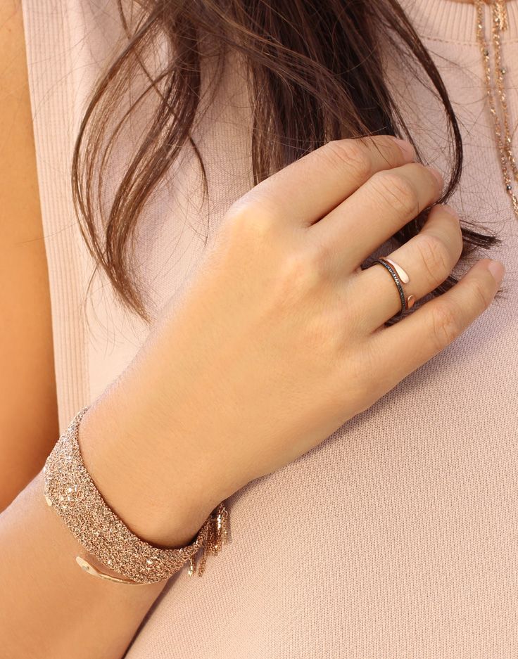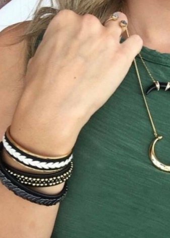 You can safely combine rings with other wrist accessories, such as bracelets and watches, but you need to follow one rule: wrist products should match in color. If the watch has a leather strap or a bracelet decorated with fabric details, it is best to have these materials close in color to the shade of gold.