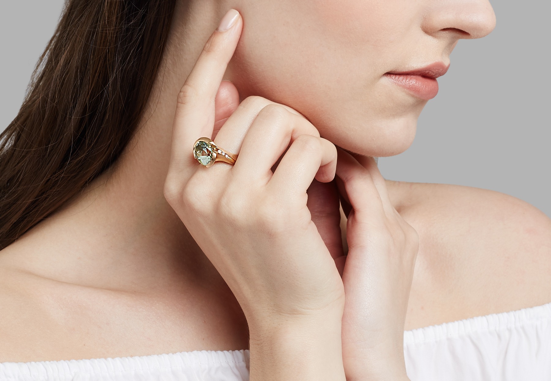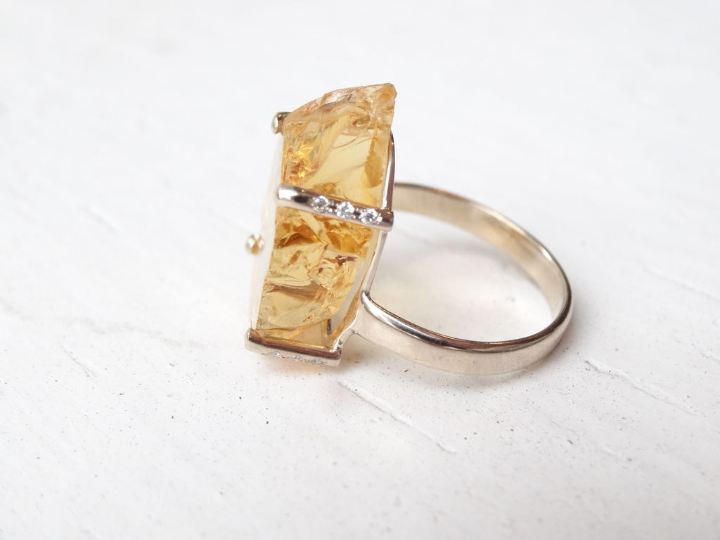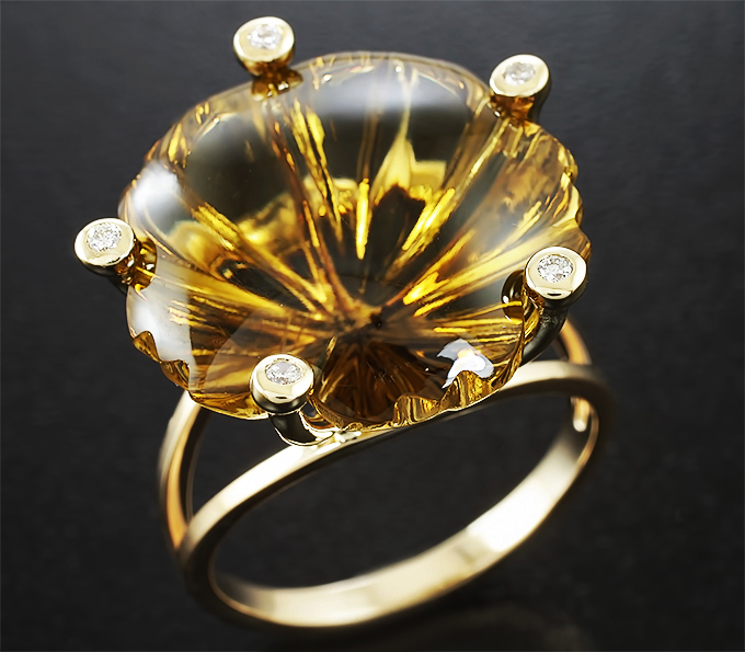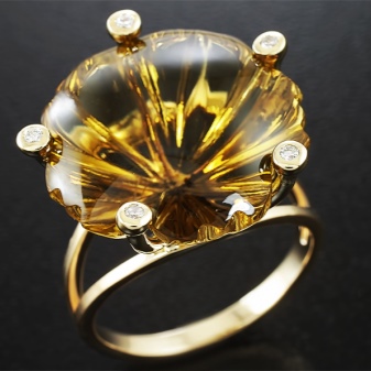 The product with citrine looks very luxurious, but not every girl will like the yellow shade of the stone, so this ring has much fewer fans than the model with alexandrite. This stone has a dark green or purple hue, deepening to the base of the fragment.