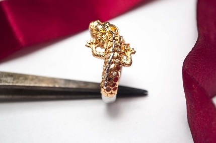 The girl, on whose finger a small dragon flaunts, will undoubtedly arouse interest and delight among the people around him. The model with a dragon is made taking into account even the slightest features and as a result of painstaking work on the product you can even see the scales of a fabulous animal.