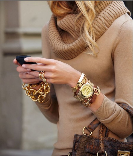 - Trendy urban bow will allow you to feel at your best even in the hectic everyday life! A stylish sweater in a milky coffee color scheme is complemented with massive accessories in the form of bracelets and watches, and slim fingers adorn massive gold rings.