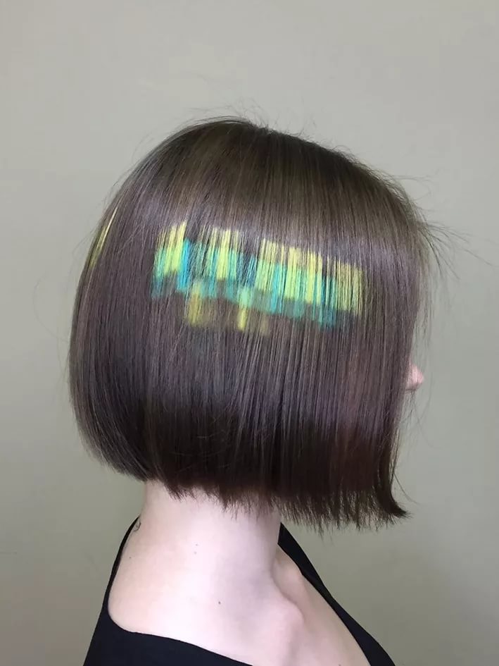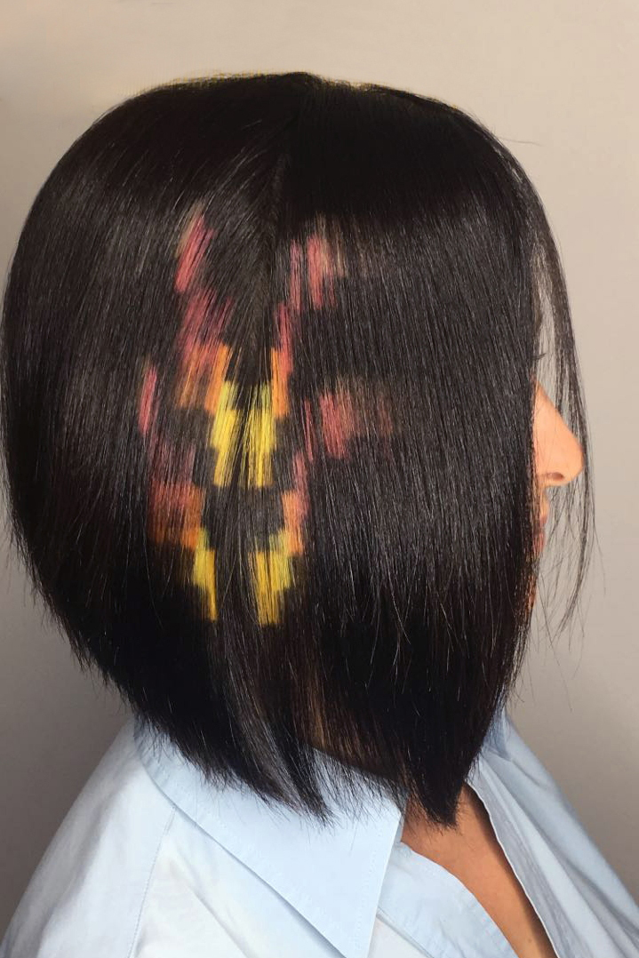 The painted zones on the head are arranged chaotically. Their color is in harmony or represents a contrast with the native hair color.