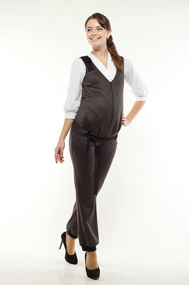 Under the tummy is an elastic tape that reliably supports it. The overalls protect the abdomen and lower back of a pregnant woman during bad weather, preventing them from getting cold. The clothes follow the lines of the figure of a pregnant woman, so future mothers feel comfortable in it.