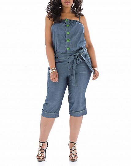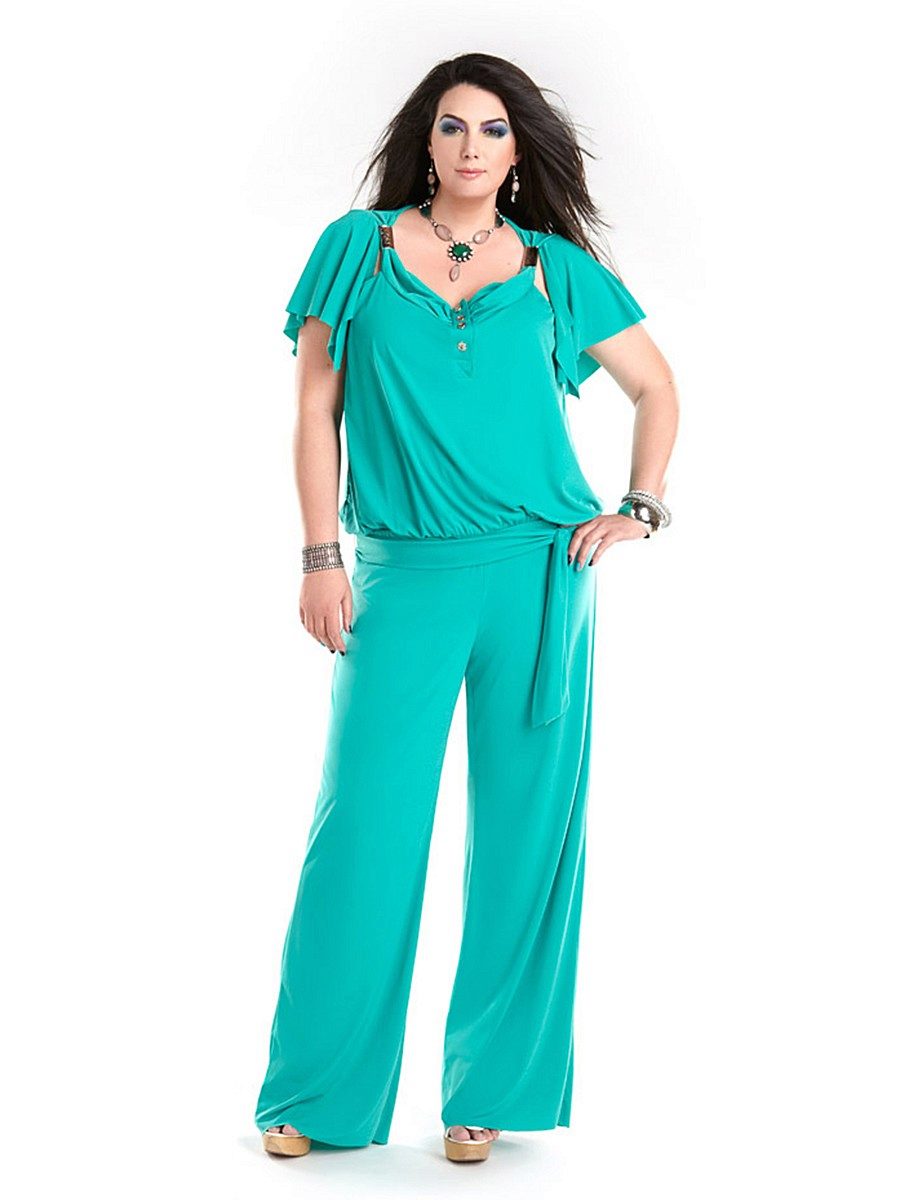 Gingerbread girls can wear a denim summer jumpsuit with straps. Decorated with zippers, lacing, it will visually make the figure more slender. You do not need only to choose the version with shortened leg - it will visually reduce your height. On plump young ladies, a cotton jumpsuit with a top in the form of a shirt also looks good, while the lower part of the product should be wide. Also relevant models with the upper part - T-shirt low-key colors.