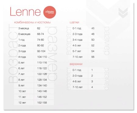 Jumpsuits from the brand Lenne are designed for children from birth to 17 years. They are represented by a dimensional grid from 62 to 158, which coincides with the growth of the child. Models for kids can be bought larger. For example, a jumpsuit from 92 to 104 is ideal for a child of three years. For a child of six years, you should purchase a model from 116 to 122 sizes. In ten years, you should already look at sizes from 140 to 146.
