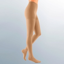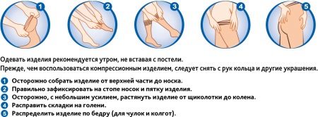Some training is needed before you can wear compression tights quickly and correctly. Put them on after sleeping, lying down, without dropping their legs out of bed. This should be done carefully so as not to stretch or twist the product. Tights are collected "in accordion" and gradually put on the foot, then gently straighten the lower leg and pull on the hips to the waist.
