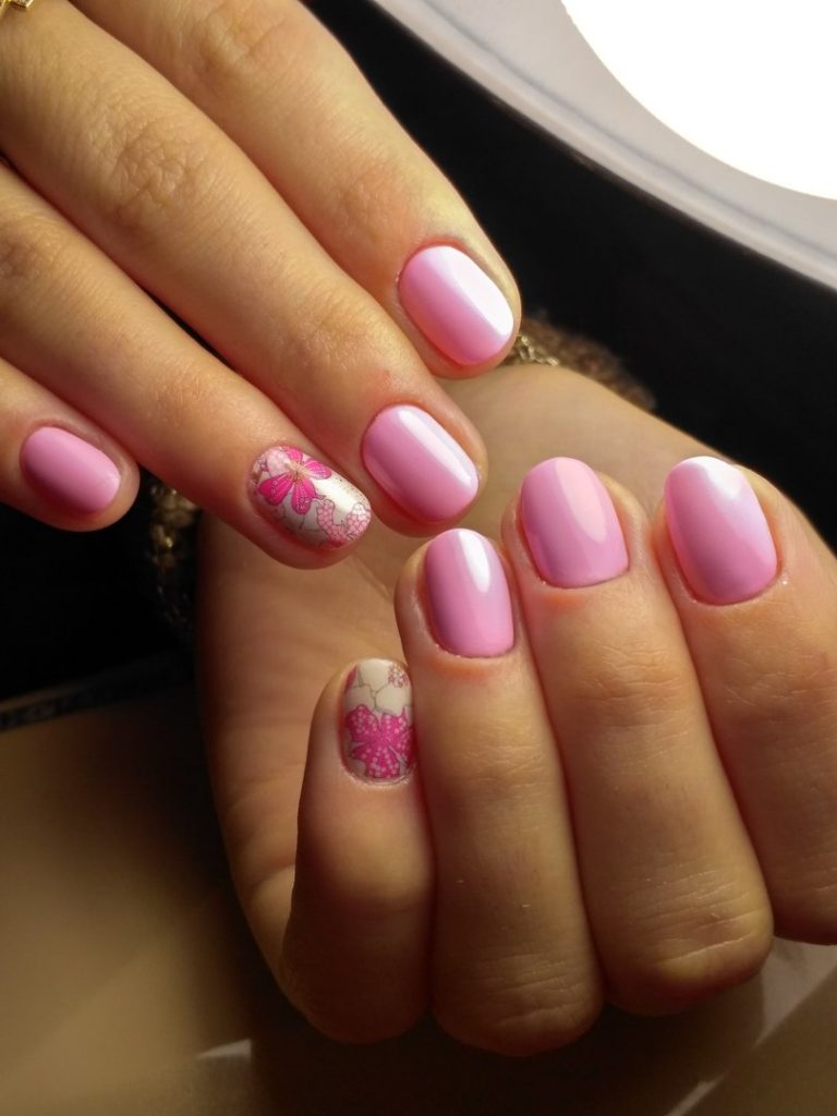 Very nice and gentle on the nails look pictures in the form of flowers. Such decorations can emphasize the charm of short well-groomed marigolds. Instead of flowers, many ladies prefer pictures in the form of juicy multi-colored fruits. Pictures of stars or hearts look just as original and stylish. Many of these decorations can be painted independently using stencils or a thin brush. If you do not want to spend time on such a design, you can contact an experienced master.