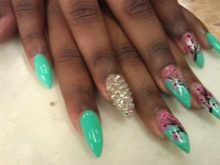 On the "almond" look different designs. At the same time, such marigolds are shown even to ladies with plump handles and not particularly graceful fingers. Almond shape corrects visual imperfections and gives grace to brushes. But brittle and weak nails are best done round or oval. At least for the period of treatment. Because the "almond" requires careful wear and at least minimal, but the same length. Otherwise, to create such a beautiful shape on short nails will not succeed.