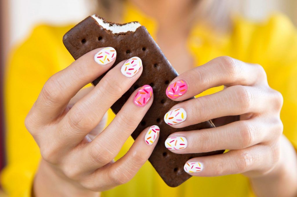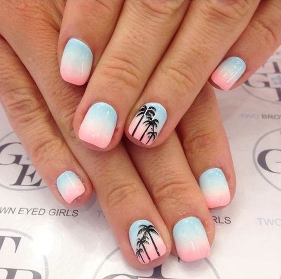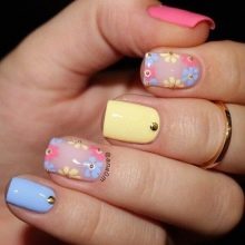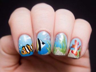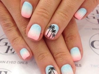 Most of the creative solutions for nail design are offered for such short and neat claws. Seasonal themes of the phenomena of different seasons - leaves, palm trees, fruits, snowflakes, Christmas trees and so on. Sea theme holiday pores - vests, anchors, fish, dolphins, juicy colors of summer, neon. French is relevant in different variations with inverted holes, transparent or colored with a contrasting color, stencil design, gradient, ombre.