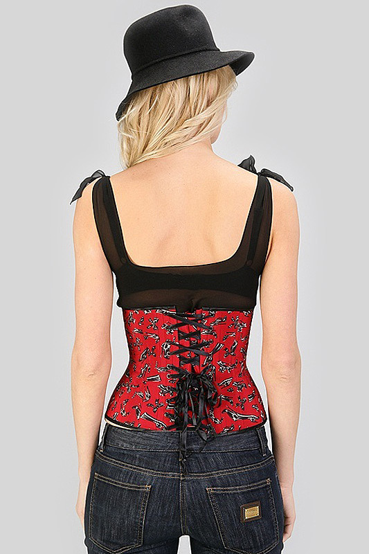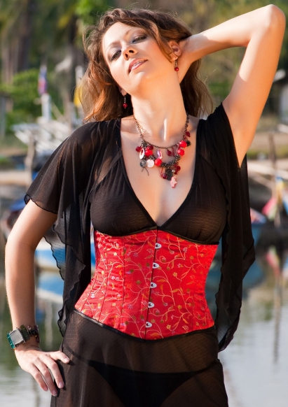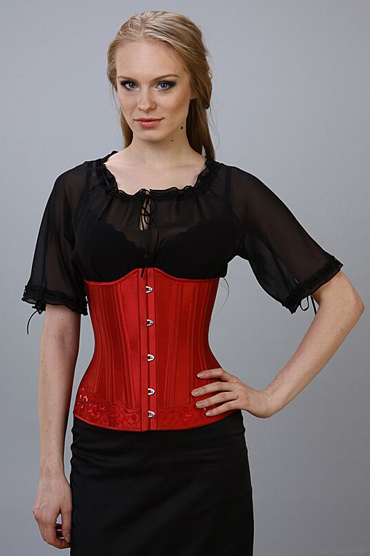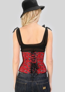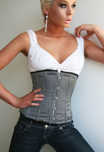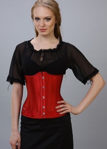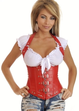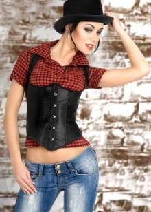 - The same version of the corset can be used to create a brighter, seductive image. A red short-sleeved shirt looks great with a black slimming product, and jeans bring a bit of lightness and ease into the look.