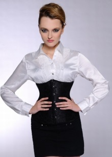 - The outfit option, which could well fit into office workdays, consists of a snow-white, slightly elongated shirt and a sleeve tucked to the elbow and a black skirt - a pencil to the knee. The dress is complemented by a stylish black corset with an openwork pattern, from which the bottom edge of the shirt peeps out.
