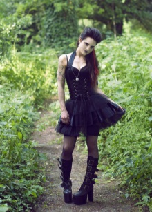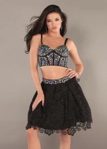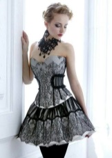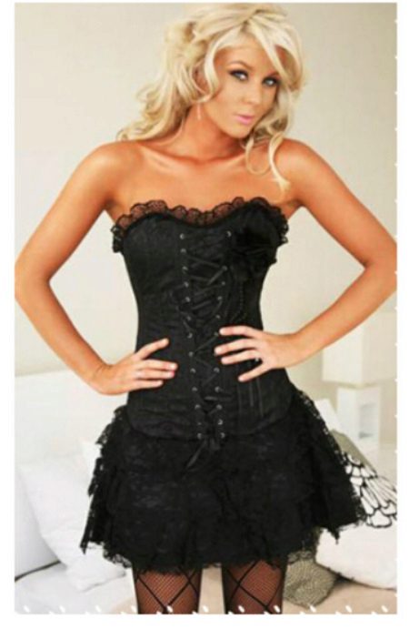 Do not you have the breath of this image, in which the main elements is a black corset with lace elements? It is immediately obvious that the corset is chosen correctly, it sees well on the body, it highlights the chest and delineates the waist. Lace short skirt is very appropriate here. Her free style dilutes the narrow top, and the airiness makes the sexy image easier and more playful. Black tights with a large pattern does not look vulgar. This image is definitely worth a note.