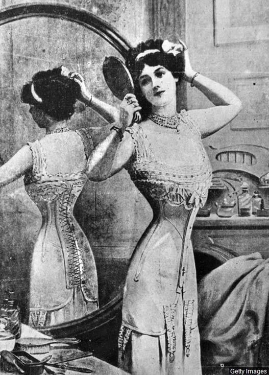 European women began to use corsets in their images only at the end of XIII century. Their corsets had the shape of a wide belt that tightened the waist and supported the chest. With the onset of the 15th century, wasp waistline came into vogue. Women had to tighten their waists so much that the blood circulation was disturbed, the level of oxygen in the body decreased, and fainting became a frequent occurrence.