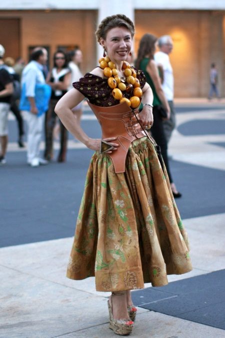 - Corsets can also be used as an independent element of the image. The laconic design of such corsets allows you to wear them over dresses or blouses. In this case, the image will change dramatically. Brave young ladies choose leather corsets, which when combined with simple things give the image of dangerous sexuality. Also, everyday corsets can be worn directly on the body, making the figure more refined. Perhaps the most successful combination is based on the use of a corset, a blouse with lace elements and a long loose skirt.