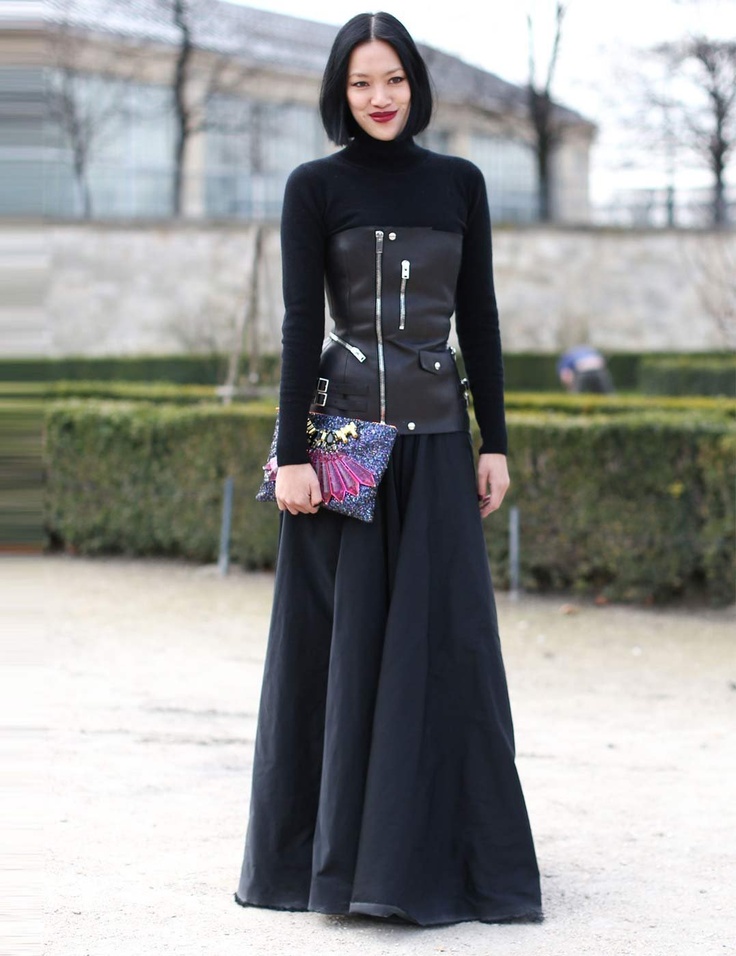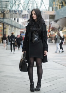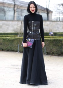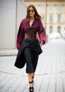 Stylists are advised to wear a black leather corset top with a flowing skirt or a dress to the floor. Or a corset under the chest with an evening dress to the knee. This combination will emphasize the waist and add breast volume. Complement this image with feminine jewelery and stiletto heels.