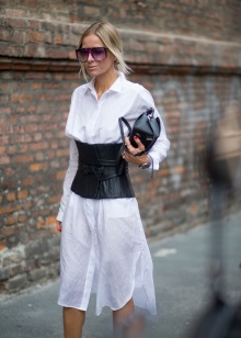 It will be perfectly combined with blouses or dresses made of light fabric or with straight female trousers of light colors. The leather belt-corset will be ideally combined with a snow-white shirt or turtleneck in the color of a corset. A corset in the form of a top will look harmoniously in combination with a fluffy skirt.