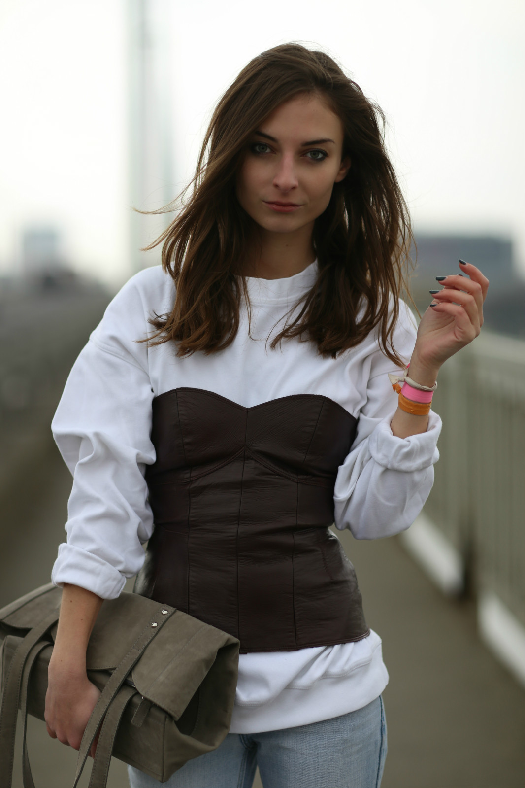 With whatever you decide to wear a model of a corset made of genuine leather, it is important to remember that the corset should be the only leather element in the image.