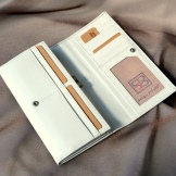 Another wallet model, borrowed from men, is a product with an external pocket for small items. Typically, these wallets unfold like booklets. Bills in them can be folded in two or three times. Such a wallet, despite its capacity, is very compact. It fits even in a small handbag.