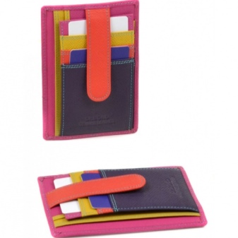 For girls who rarely use cash, card holders are created. They are made on the same principle as the money clips. Most often, these are purses of a vertical orientation, consisting of two flaps, like a passport cover. There is no holder inside, but there are many pockets for plastic cards and one small compartment for notes.