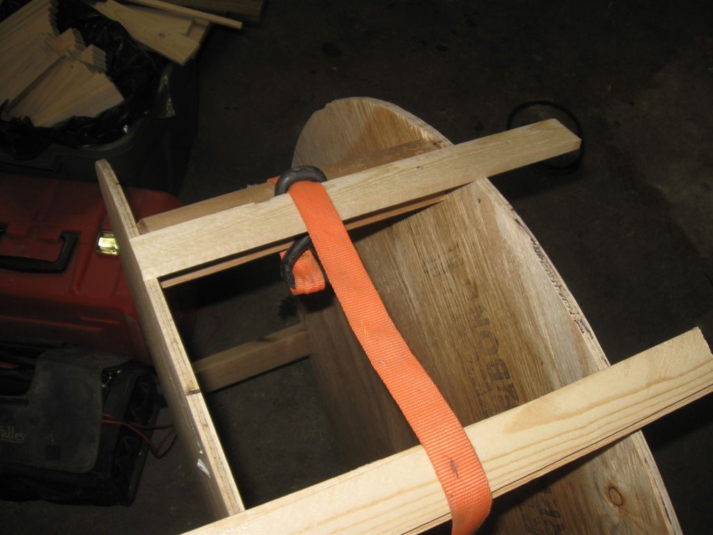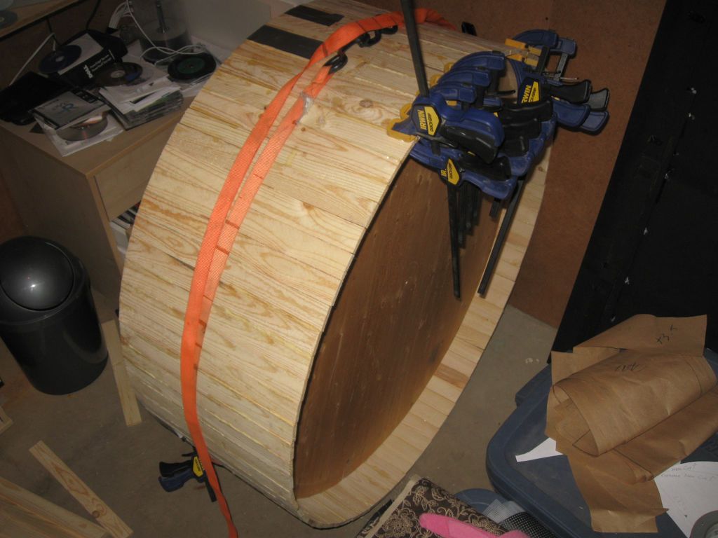 Bars in turn are fastened with plywood using a screwdriver, glue or ordinary nails. The empty cavity between the circles needs to be closed and is done by gluing the rails around the circumference of the wheel. To make the construction stronger, the slats are overtightened with a thick rope or belt.