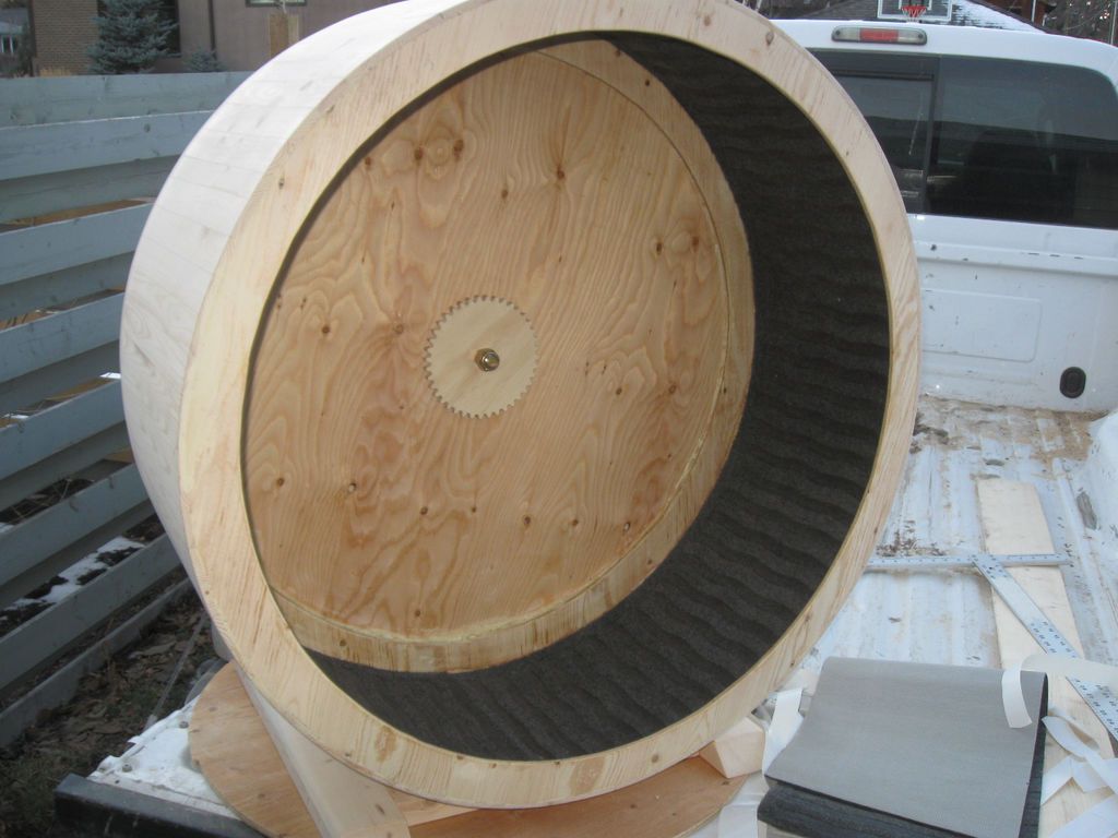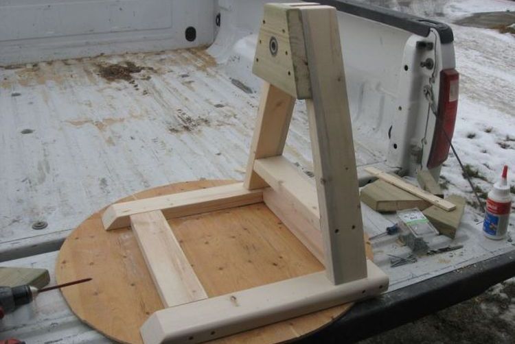 For the manufacture of coasters will require two small pieces of plywood in the shape of a semicircle. From two sides it is installed on a pair of rollers, which will rotate the structure. For the half-closed structure, it is necessary to make a special axis for rotation and attach it to the side wall of the wheel.