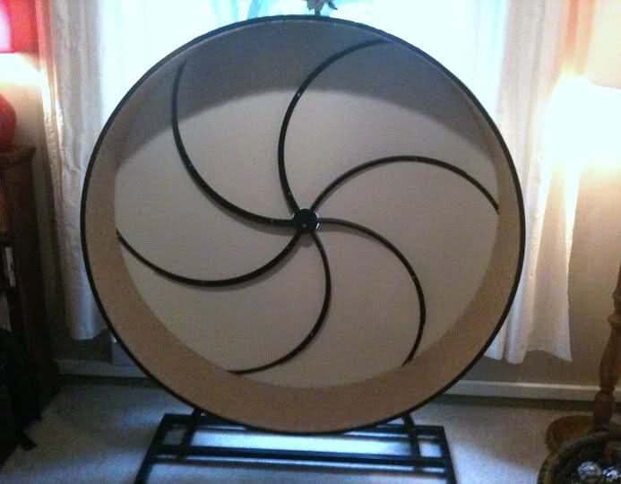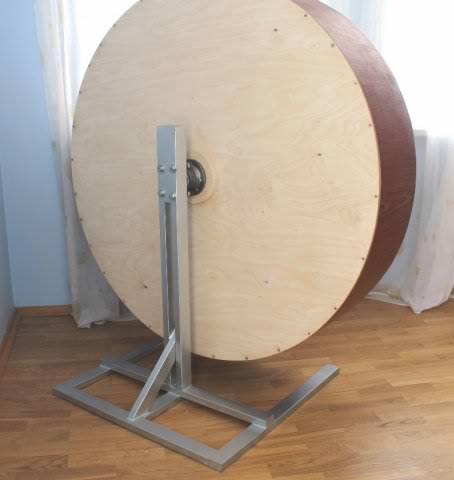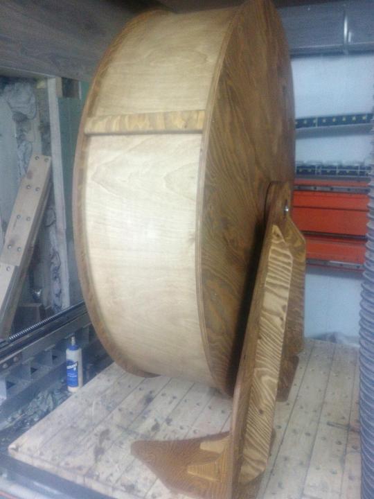 When all elements of the wheel are glued to each other, you will need to cut one or two sides, depending on the type of future construction. Next, you need to make a stand with wheels and attach it either to the side wall of the drum, or directly under it.
