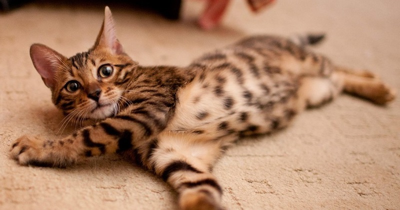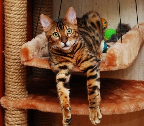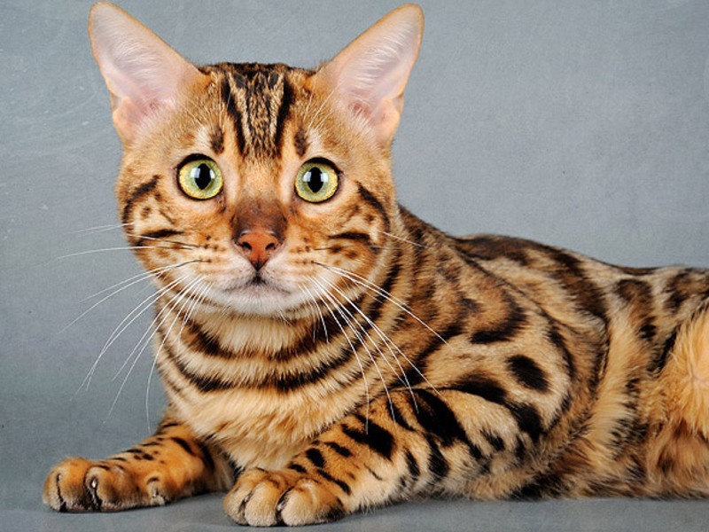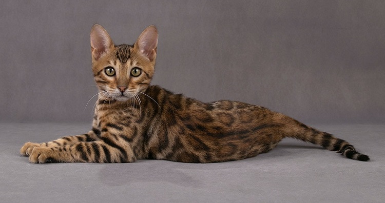 The Bengali breed is distinguished from domestic cats primarily by its unusual color. On the soft, dense, shiny wool pronounced dark spots of rich chocolate or black. Strong bones slightly stretched in length. The front legs are slightly shorter than the rear. Cats are distinguished by muscularity.