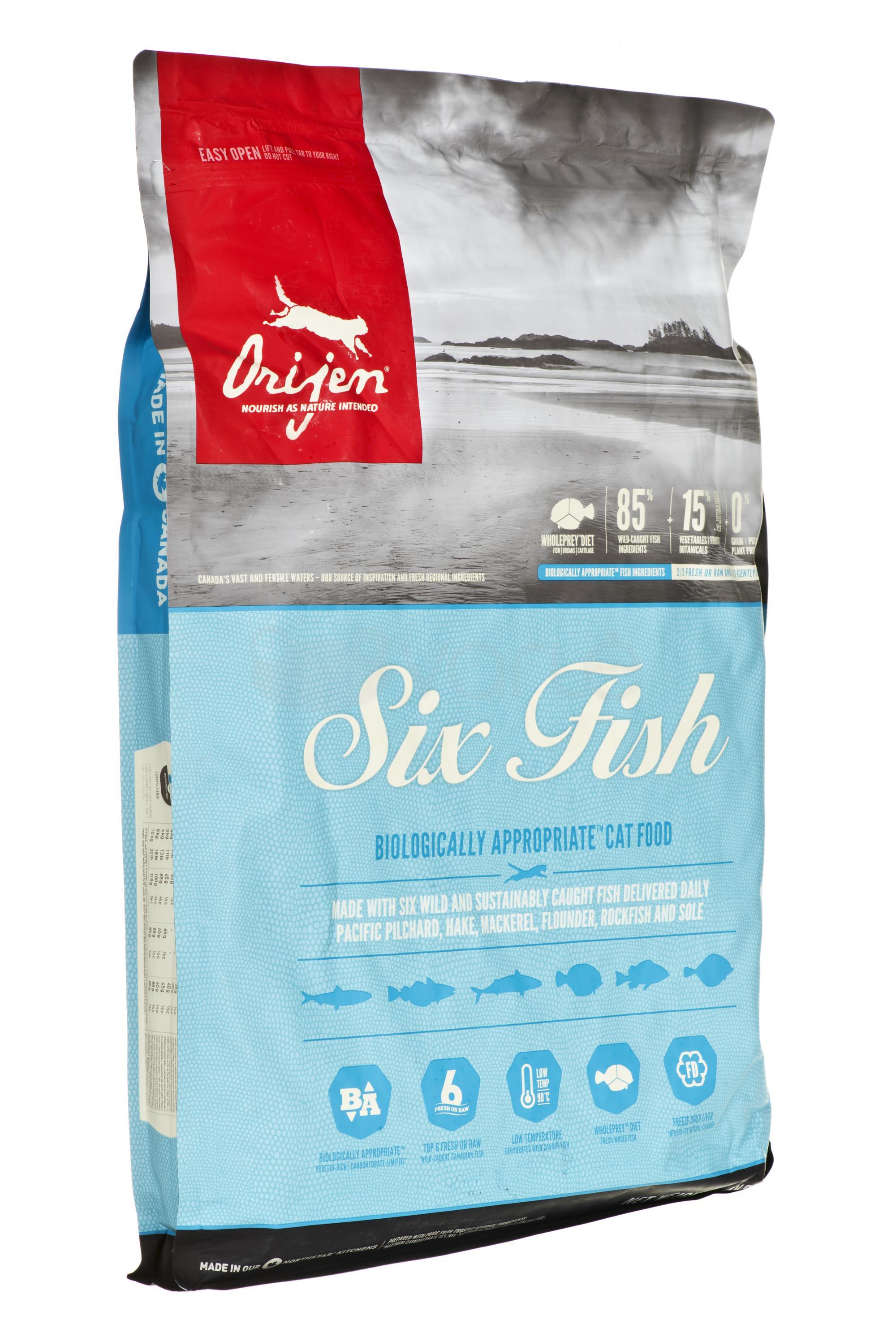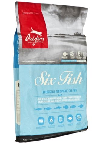 - Orijen Six Fish Cat. This is a holistic based on fish. It includes all the necessary elements for active cats. The composition of this product includes 42% protein and 20% fat. Protein is taken from various fish, such as salmon and herring. This composition is optimal for the cat.