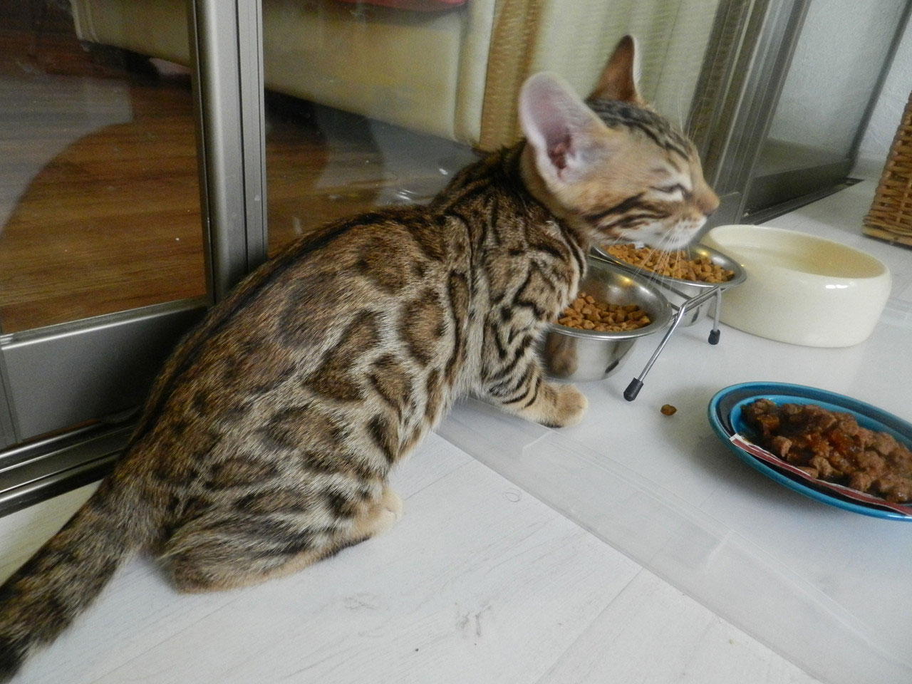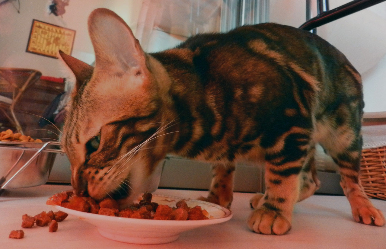 Bengal cat is half predator, therefore meat must be included in her diet. Her stomach has a shortened form, which indicates the impossibility of feeding only plant food. Food should be presented in large pieces, because this size allows for the prevention of various diseases of the teeth.