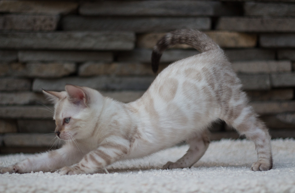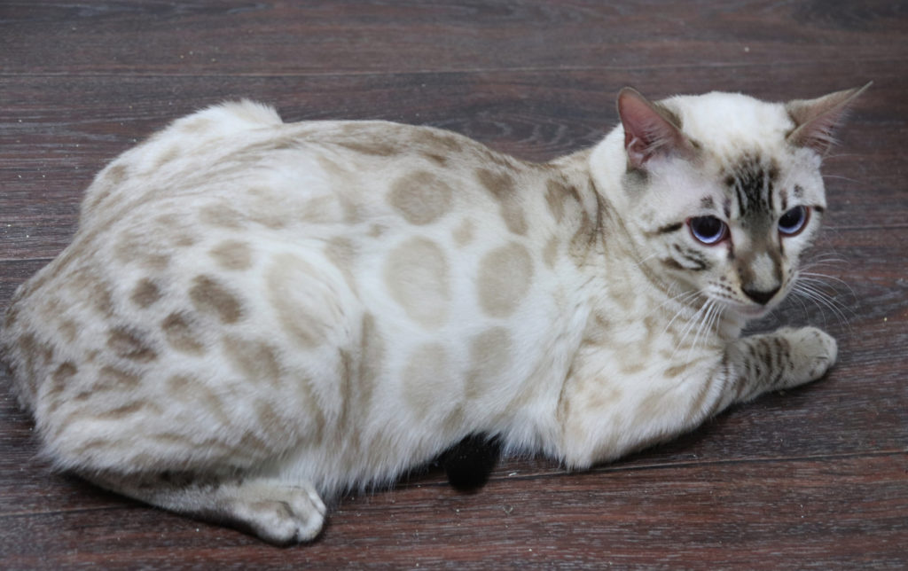 These beauties were born as a result of crossing Bengal breeds with Siamese breeds of cats. Their body is completely white with small beige markings, which are called points. The difference between the background and the drawings is almost imperceptible, however? the specks are quite pronounced.
