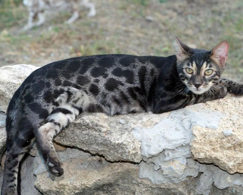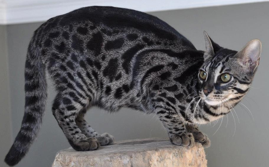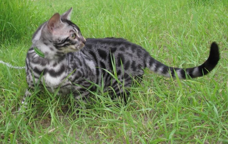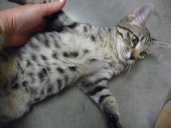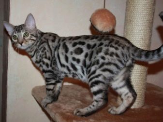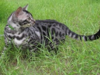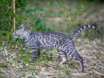 The gray Bengal cat is a small animal with developed muscles, an elegant muzzle and small ears. The peculiarity of the breed is leopard color, black foot pads and the tip of the tail. A pet can weigh from 5 to 7 kilograms, and lives on average up to 12-15 years.