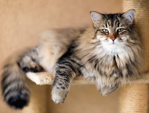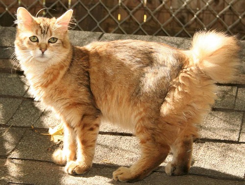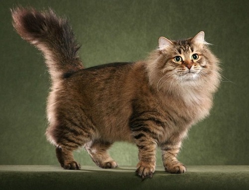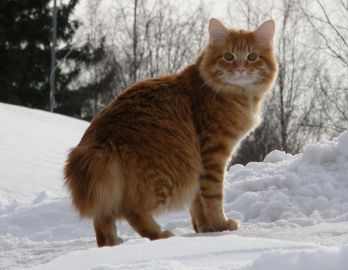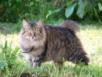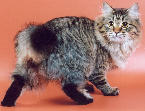 Cats of this breed are large, with semi-long thick hair of different colors, not afraid of water. The triangular head is crowned with wide ears with tassels, like a lynx. Oval large eyes iris by breed standards must be in harmony with the coat of wool. Cats of this breed are characterized by the presence of a "collar", "beard", "panties" and a fluffy long tail, the tip of which can reach the cat's shoulders.