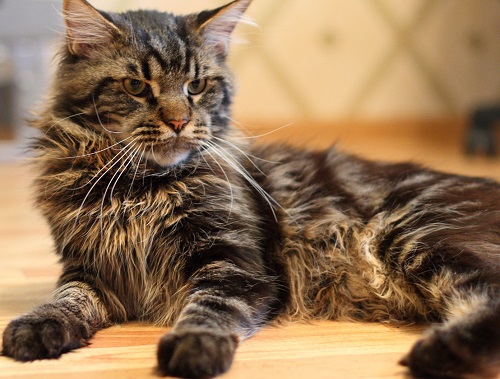 Maine-coons are long-haired breeds with short hair on the head and shoulders, and longer on the sides. Some cats have a noticeable collar around the neck. This breed is characterized by bunches of long hair between the paws, facilitating walking through the snow. Thick undercoat and long hair protect against frost and wind, which are so famous Men.