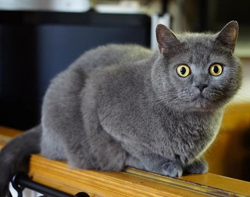 A sturdy, squat cat with a large round head, on which large, wide-open eyes and small, low ears with rounded tips are clearly visible, has a thick, soft fur. Adults can weigh up to 12 kg, but these cats are prone to obesity, so it is extremely important to monitor the pet's diet.
