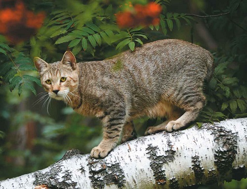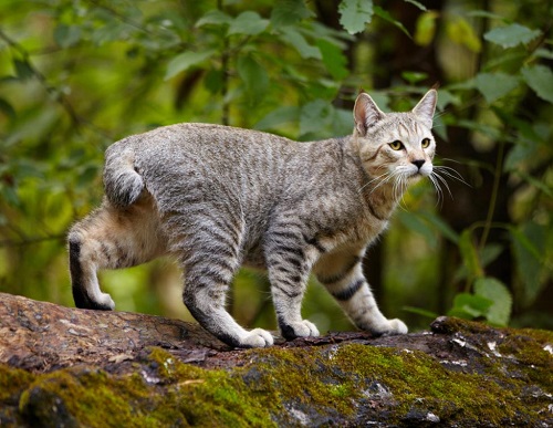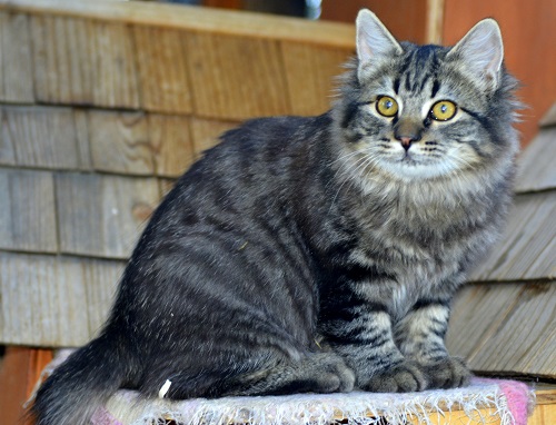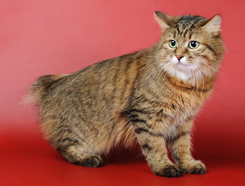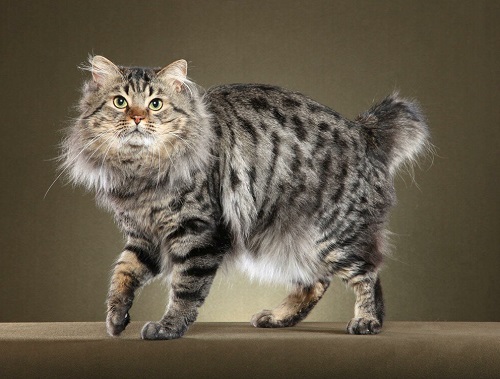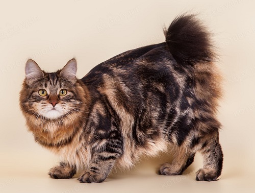 A rather large cat weighing up to 8 kg has a massive body, standing on strong large paws, covered with thick short or semi-long (up to 2 inches) hair. The head of a cat has the shape of an inverted pear with lynx-like sideburns. The eyes are set deep and half closed, which is why their appearance resembles soft triangles. Ears are topped with characteristic tassels. A special detail stands out for a short tail, just like a wild fellow.