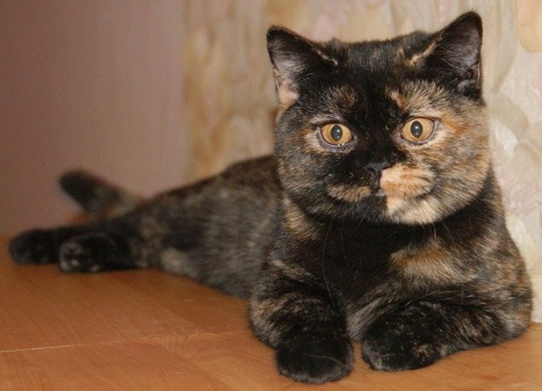 Very interesting color - tortoise (tortie). Here, the most intricate variations of multicolor from patchwork color to the presence of small specks are possible. This color can contain up to 80 very different colors. The main condition is that all this diversity looks harmonious. Tortie kitty hair is short, compacted, soft, matte, without a glossy shine. The eyes are traditionally golden or copper hue, but as for the nose and pads on the paws, there may be several options: the monogamous colors are pink and black, as well as a combination of both colors.