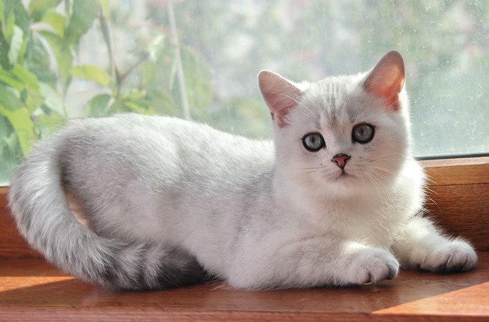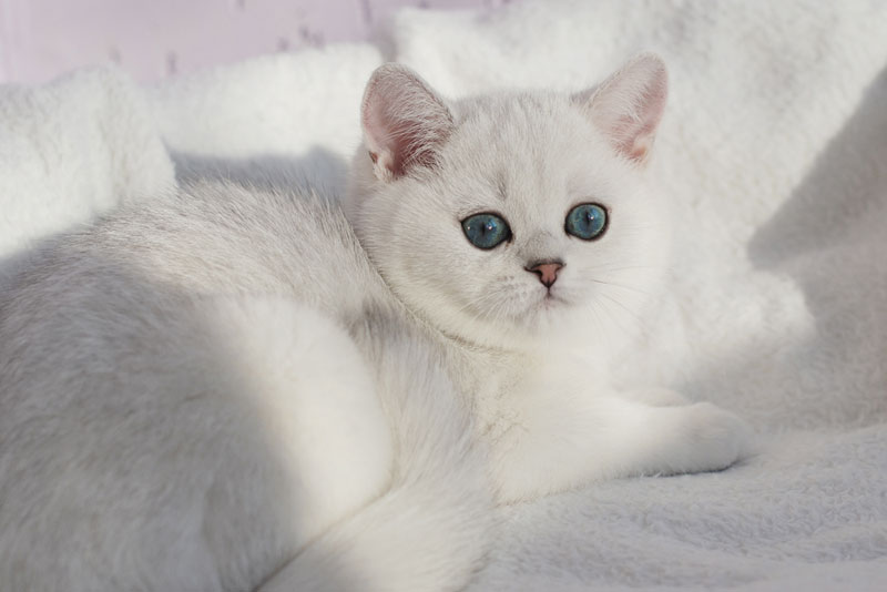 Silver-colored British chinchillas have a basic tone of wool and undercoat - white-white, and only at the tips dark color prevails, creating a play of silver shade. The tip of each hair is only one-eighth colored black, the rest is white.